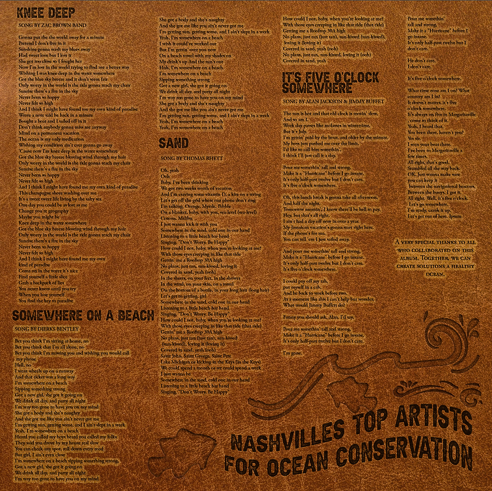 Ocean Conservancy is working with you to protect the ocean from today’s greatest global challenges by creating a Country Music charity album to support the efforts. 100% of album proceeds go to the Ocean Conservancy’s International Ocean Cleanup. All of the songs will have the common theme of the beach, oceans, water, summer and are gathered onto an album with a rustic, leather look.
